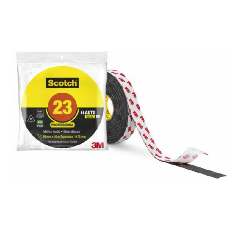 A Fita de Autofusão 3M Scotch 23 cria uma conexão segura e firme, fundindo-se a ela mesma. Pode ser alongada em até 800% para proporcionar isolação inviolável. É resistente à umidade e as propriedades físicas e elétricas não são afetadas pelo grau de alongamento.